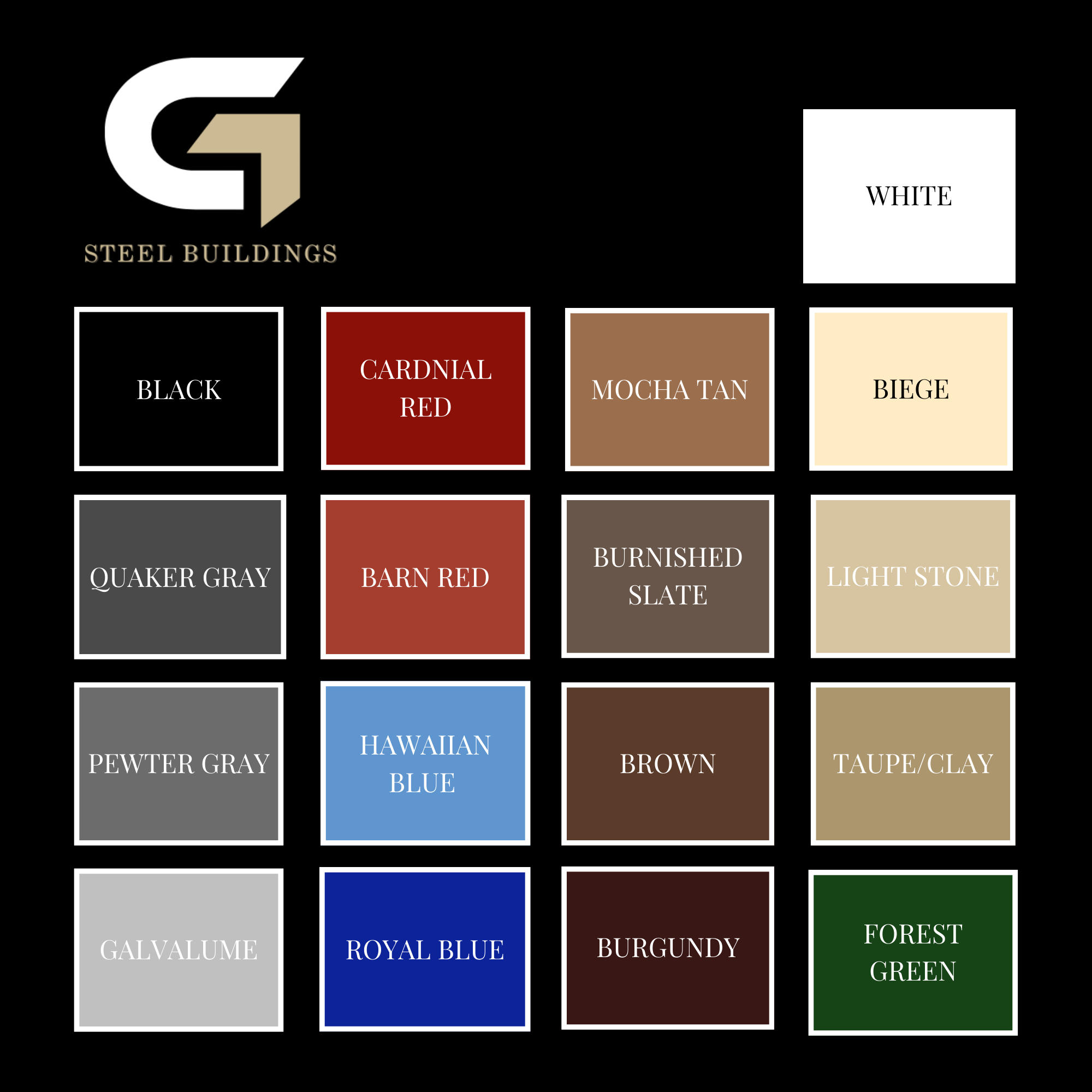 Choose from a wide variety of colors and combinations to customize your steel building’s look. Create a style that fits your taste and stands out. We also offer color matched screws for any of our color options